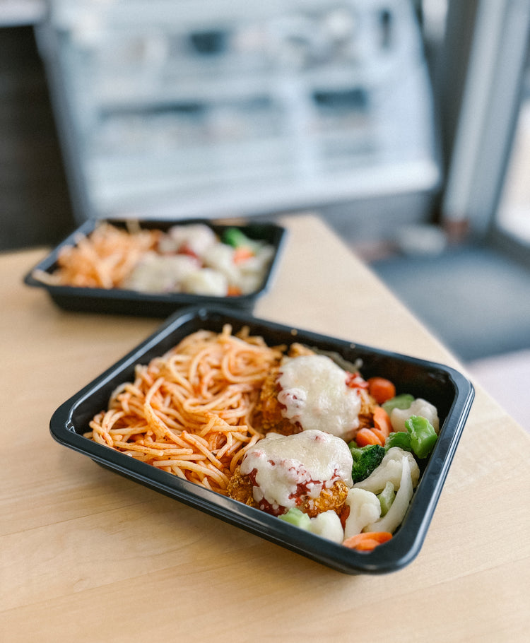 Ingredients: Boneless Chicken Breast Pieces, Spaghetti (Wheat), Marinara Sauce (Tomato, Basil, Olive Oil, Onion, Garlic), Mozzarella Cheese, Parmesan Cheese, Cornflakes, Panko Breadcrumbs, Paprika, Salt, Pepper, Side Vegetable (Cauliflower, Broccoli, Carrot Blend)
