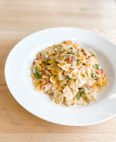 Simple & comforting. Bowtie pasta is coated in a creamy, cheesy sauce with crispy bacon.