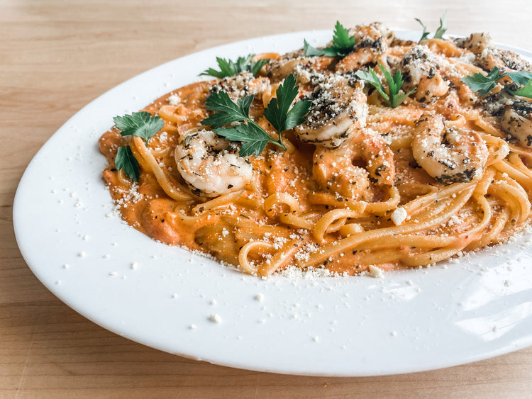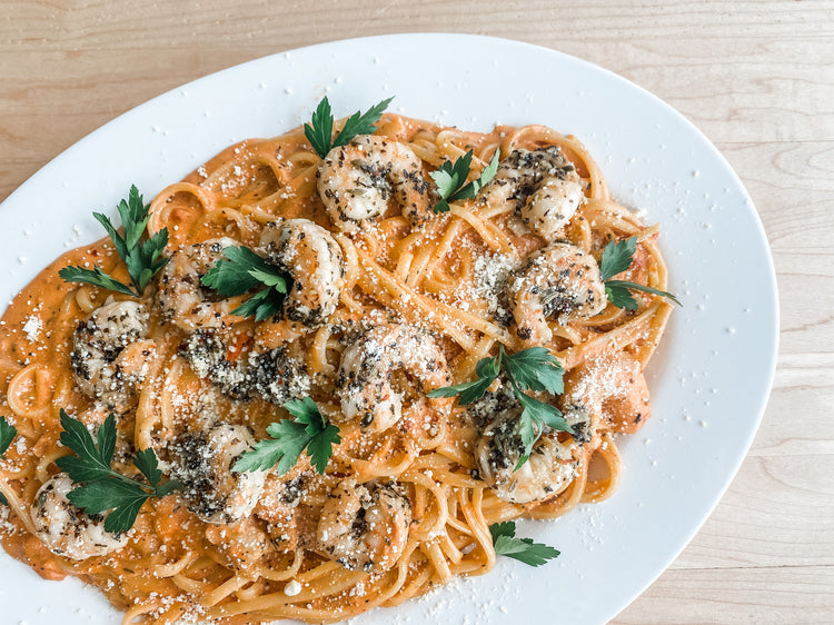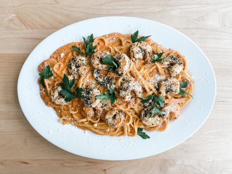 This quick cooking recipe is perfect for a weeknight, yet fancy enough for serving when company is visiting! Linguine is tossed in a luscious & creamy tomato sauce alongside buttery shrimp with basil & garlic. Includes a generous portion of Romano cheese for topping.