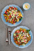 A gorgeous and simple sheet pan meal. Potato wedges are baked with Greek marinated chicken until crisp with a delicious tomato, olive & feta topping, plus a drizzle of lemon yogurt drizzle overtop!