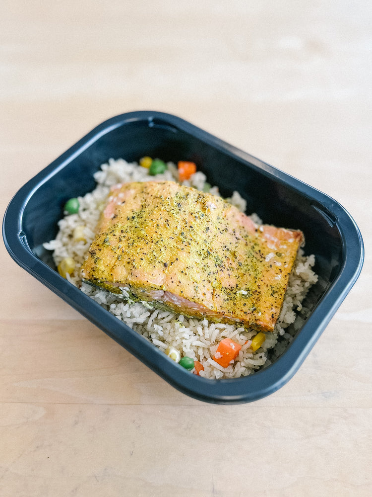 Salmon, Lemon Pepper Seasoning, Basmati Rice, Mixed Vegetables, Chicken Bouillon, Vegetable Seasoning.