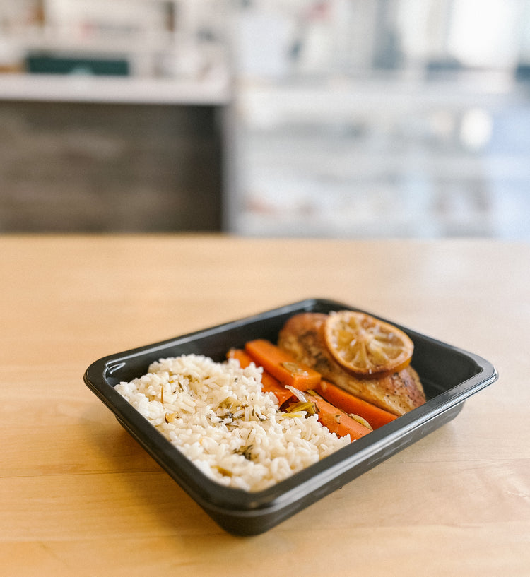 Boneless skinless chicken breasts are seared and roasted in a bright and flavourful rosemary lemon blend with carrots and onion. Served with white rice.