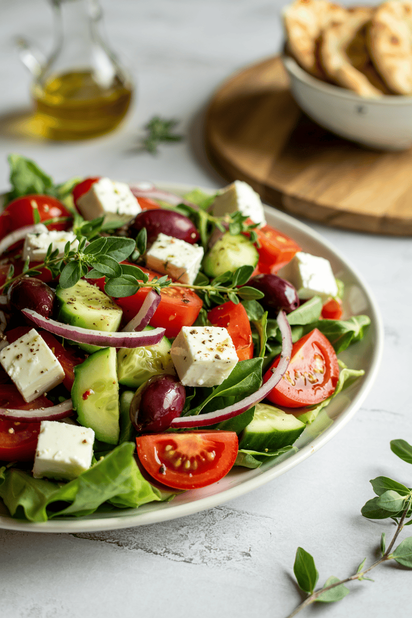 - Greek Salad (Fresh Greens, Feta, Olives, Bell Peppers, Cucumber & Tomato)