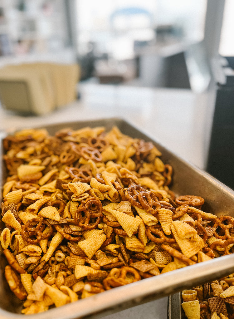 Our family recipe includes pretzels, cheerios, Chex, mixed nuts and BUGLES all coated in our secret sweet & salty spice mix and slow baked to perfection.