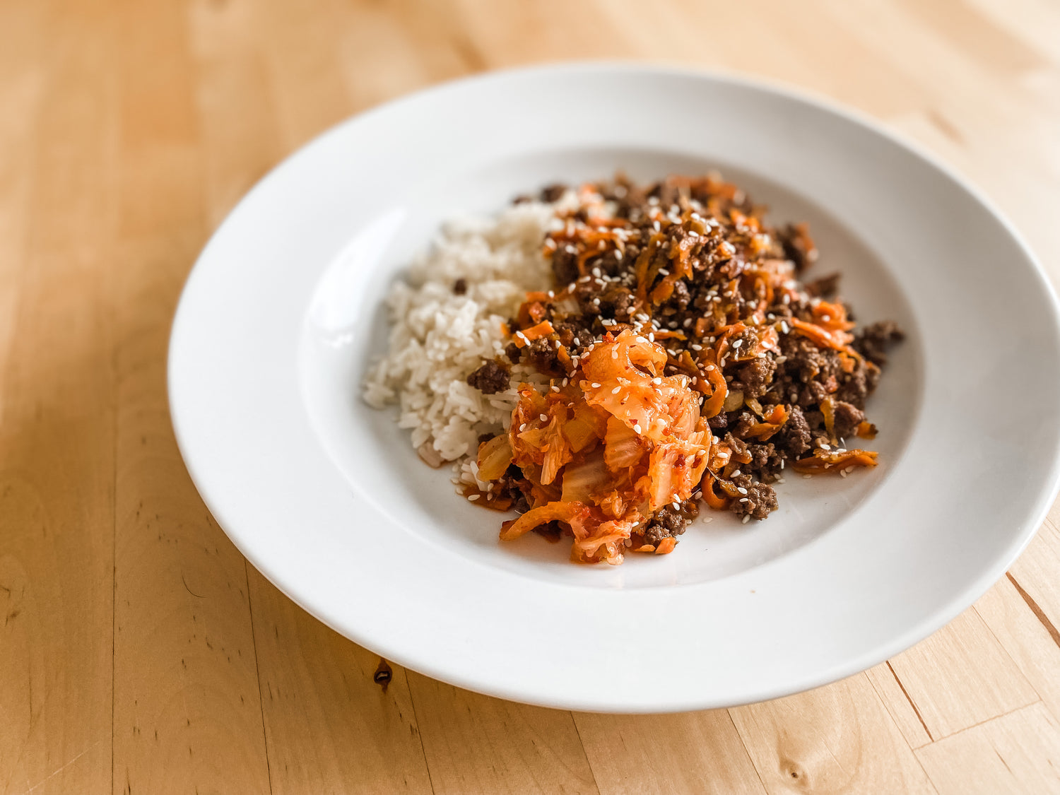 Ingredients: Lean Ground Beef, Ginger, Garlic, Sesame Oil, Green Onion, White Rice, Brown Sugar, Chili Garlic Sauce, Kimchi, Carrot, Gluten Free Soy Sauce