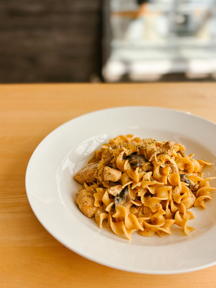 A twist on our favourite comfort food. Tender chicken strips are seared then combined with sliced mushroom, onion, egg noodles & a creamy sauce.
