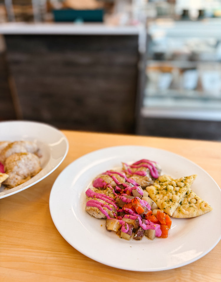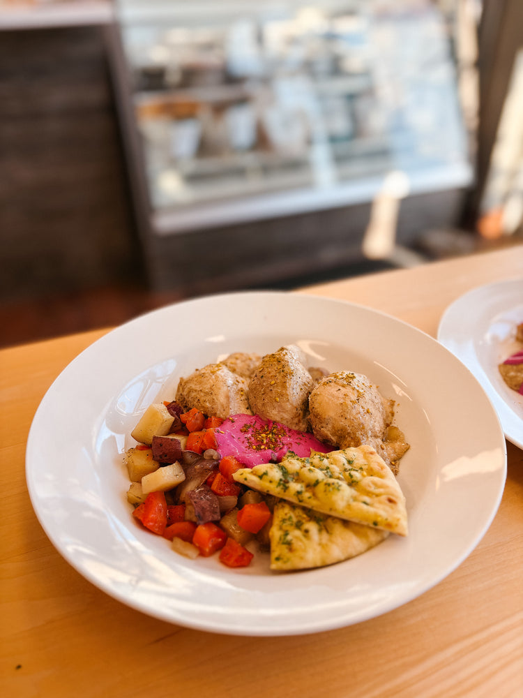 Our hearts BEET with love for you! This sheet pan meal lives up to its name, with gorgeous tender yogurt marinated chicken, blushing red onion, red potato and carrot, and a bright pink beet tahini sauce to drizzle overtop. Includes fresh pita bread for the side. This cutie is a must try this month!