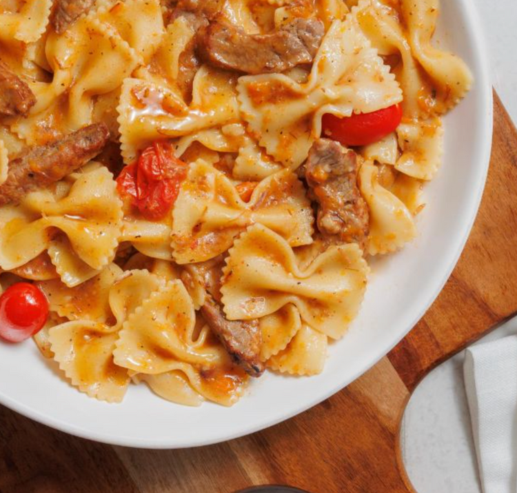 Nourishing, lean and flavourful! Sirloin steak strips are seasoned with garlic and Italian herbs. Ready to sear and toss with bursting cherry tomatoes and bowtie pasta noodles.